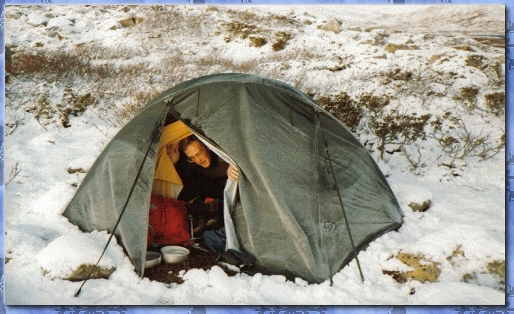 Per kigger ud af teltet efter en kold nat. Mine egne tæer var følelsesløse af kulde, og måtte varmes op i stormkøkkenet! |