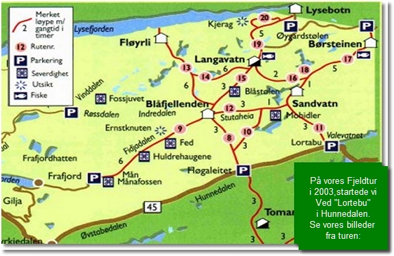 Frafjordsheia Landet af grå granit. ------------------------------------------------------------------------- Det som kendetegner Frafjordsheia og de omliggende fjeldområder, er de mange golde stenflader og frodige græsgange. Dertil skal nævnes de mange utrolig flotte og dramatiske dale. Området imellem Lysefjorden og Hunnedalen kaldes Frajordsheia . Mod Nordøst er der det svimlende Kjerag plateau og mod vest det flotte vandfald "Månefossen" Hvor krævende er området.: Området er meget kuperet at gå i og kan derfor ikke anbefales til nybegyndere med en al for tung oppakning. Med telt.: Teltpladser kan være svært at finde i nogle områder Hvis man er på tur med en gruppe unge børn, f.eks spejdere eller FDFere, så er det en god ide at planlægge korte dagsmarcher. Man skal dog være opmærksom på at nogle af dalene er svært fremkommelige på grund af "ur". Ur er områder med kæmpestore stenblokke, nogle store som huse. Især i Indredalen og I Fidjadalen skal man igennem områder med ur. Vejret.: På grund af området beliggenhed i nærheden af havet, er det ikke et spørgsmål om man får regn eller ej. Det er et spørgsmål om hvor meget og hvornår man får det. Tåge og regn er dog også en af de ting der gør en fjeldtur charmerende. Det er også det barske landskab, der er charmerende og flot, og som gør området spændende at besøge. En tur til området kan derfor stærk anbefales. Anbefalede ruter til hyttevandring: Hunnedalen (Lortebu)- Sandvatn -Langavatn -Blåfjelende n-Sandvatn -Hunnedalen kuperet terræn men flot og overkommeligt for nybegyndere på grund af de korte afstande imellem hytterne. Start fra P-plads ved Månafossen-Fidjadalen- Blåfjeldenden-langavatn-Slut ved P-Plads Øygarsstølen. Hård vandring igennem Fidjadalen på grund af ur. Spændende landskab.Tuen igennem Fijadalen tger 6-8 timer, hvis man går med let oppakning. Hvis Man går med telt og proviant så tager det 2 dage at gå igennem dalen. Gode teltpladser ved den nedlagte gård mån i begyndelsen at turen. Månafossen er et syn værd. Adgangsveje: Man kan starte fra "Lortebu" I Hunnedalen og følge ruten til Sandvatn. Ved Parkeringspladsen ved Månafossen og gå igenem Fidjadalen imod Blåfjelenden. Endelig er mulighed for at Starte ved parkeringspladsen ved Øygardstølen. Der går rute til Kjerag og til DNT Hytten "Langavatn. Det kan anbefales at sejle fra Stavanger igennem Lysefjorden til Lysebotn. Derfra kan man leje taxi op til parkeringsplads ved Øygardstølen og starte derfra. |