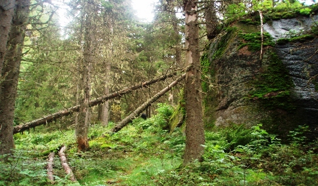 Spændende urskov og hyggelige hytter i området.
